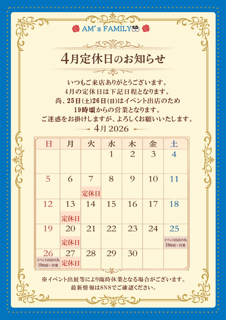 2026年4/7㈫、4/13㈪、4/20㈪、4/27㈪は休業日です。